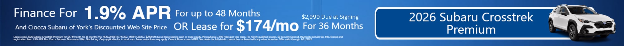 Ciocca Subaru of York is a family-owned, full-service dealership serving York and other parts of Central Pennsylvania. Your transportation needs are our priority. We sell the latest Subaru sedans and SUVs, including the Subaru Crosstrek, Subaru Forester, Subaru Outback, and more. Visit us for a test drive to find the perfect vehicle that works for you.